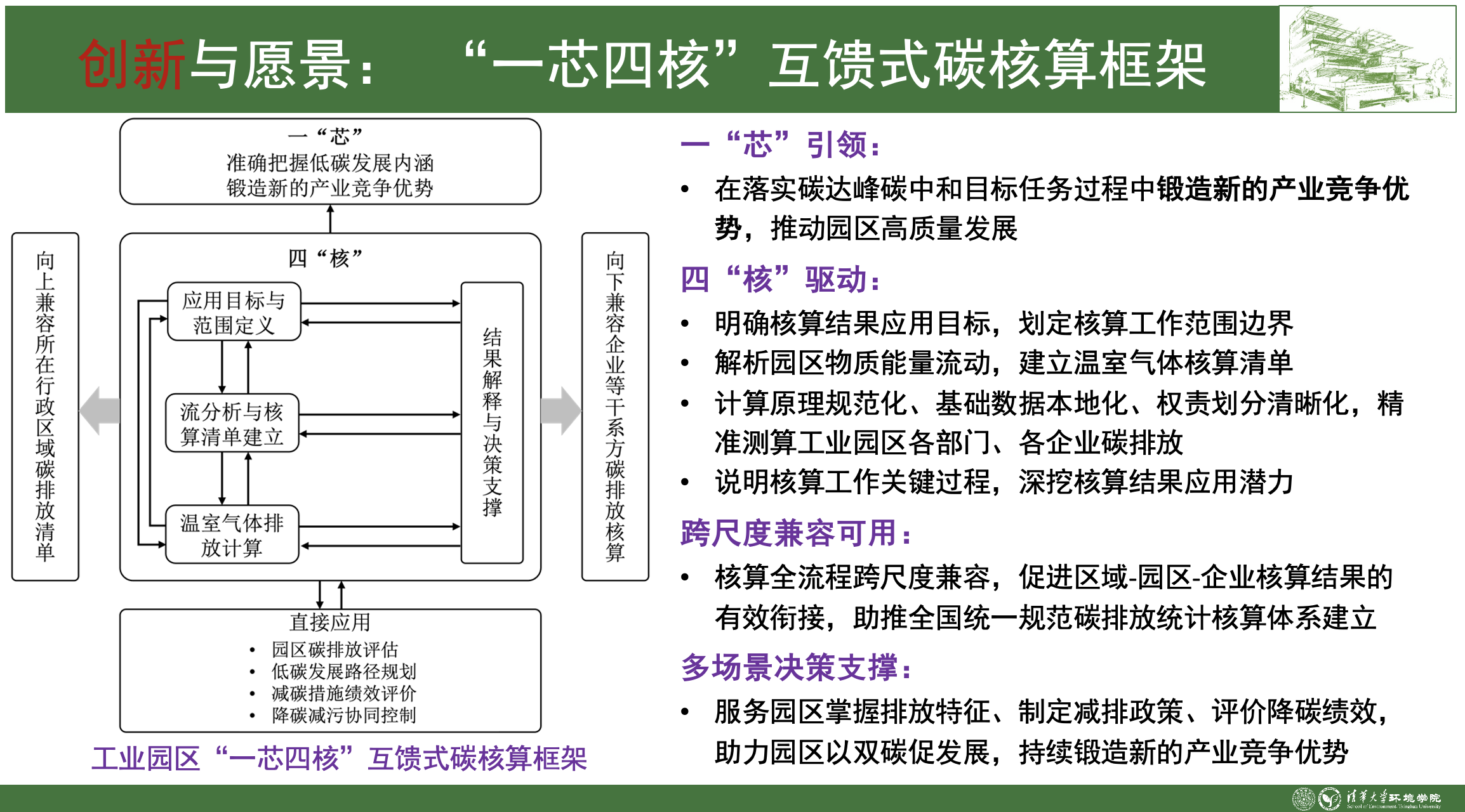 (1)园区“一芯四核”互馈式碳核算框架。一“芯”引领,是指在落实碳达峰碳中和目标任务过程中锻造新的产业竞争优势,推动园区高质量发展。四“核”驱动,分别指:明确核算结果应用目标,划定核算工作范围边界;解析园区物质能量流动,建立温室气体核算清单;计算原理规范化、基础数据本地化、权责划分清晰化,精准测算工业园区各部门、各企业碳排放;说明核算工作关键过程,深挖核算结果应用潜力。核算框架在“一芯四核”的驱动下还应实现向上和向下的全流程跨尺度兼容可用,促进区域—园区—企业核算结果的有效衔接,助推全国统一规范碳排放统计核算体系建立。核算框架可应用于多场景决策支撑,指导园区掌握排放特征、制定减排政策、评价降碳绩效,助力园区以双碳促发展,持续锻造新的产业竞争优势。