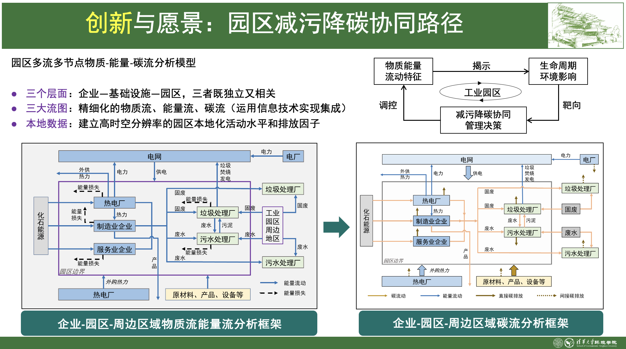 (3)园区减污降碳协同路径。建立了高时空分辨率的园区本地化活动水平和排放因子,构建了园区多流节点物质-能量-碳流分析模型,描述物质能量流动特征,揭示园区全生命周期环境影响,为园区减污降碳协同提供管理决策。