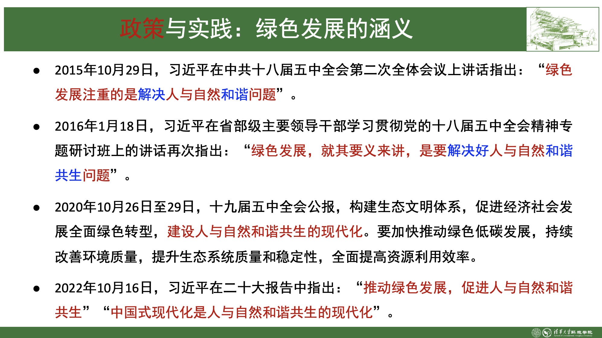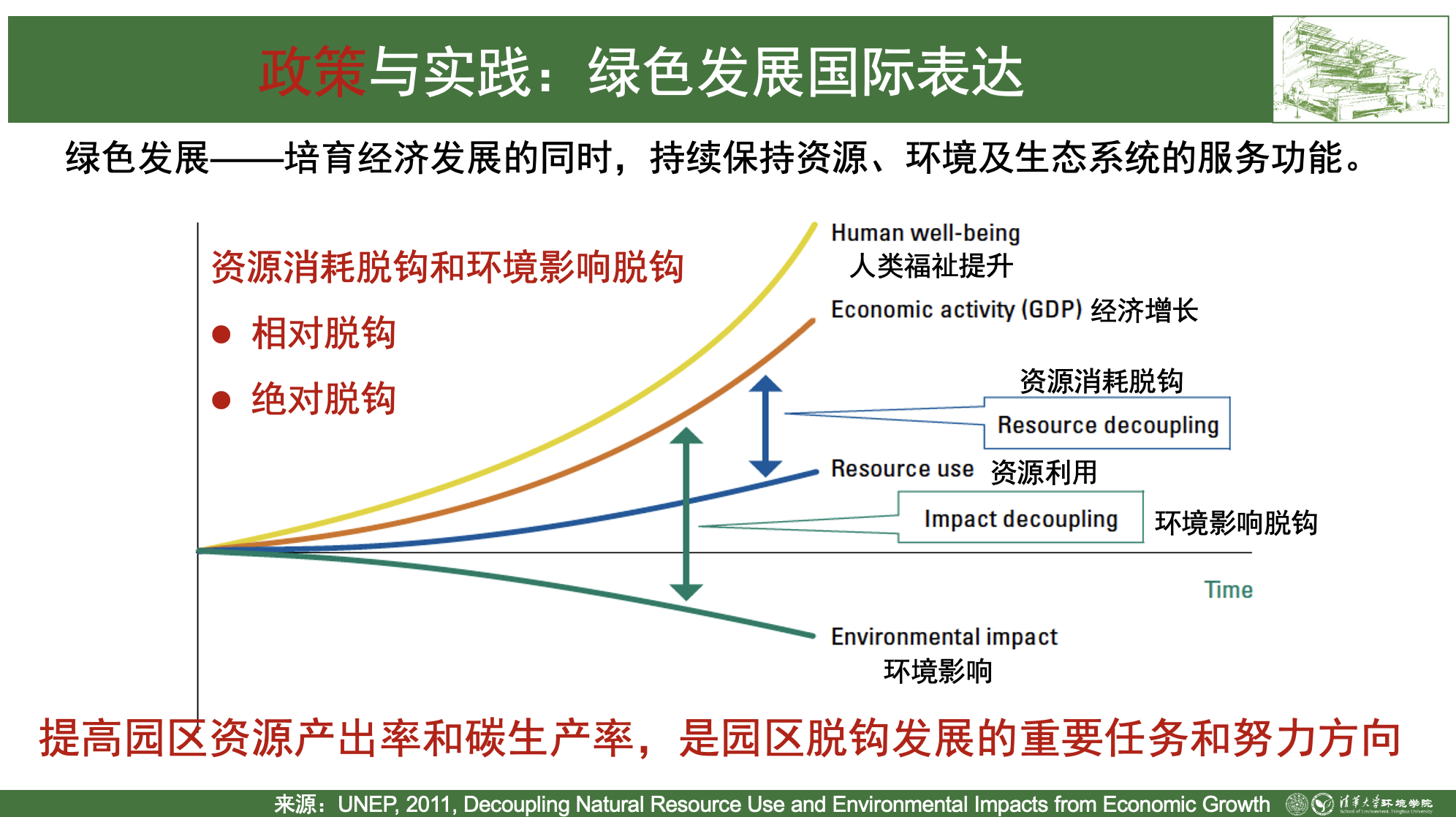 绿色发展的本质是人与自然的关系问题,这里摘录了习近平总书记几次对绿色发展的论述。2015年10月29日,习近平总书记讲:“绿色发展注重的是解决人与自然和谐问题。”2016年1月18日,习近平总书记指出:“绿色发展,就其要义来讲,是要解决好人与自然和谐共生问题。”从“解决”到“解决好”,从“人与自然和谐”到“人与自然和谐共生”,既强调了绿色发展的动作,更突出了结果。2020年10月,习近平总书记在十九届五中全会上指出,构建生态文明体系,促进经济社会发展全面绿色转型,建设人与自然和谐共生的现代化。2022年10月16日,习近平总书记在二十大报告中指出:“中国式现代化是人与自然和谐共生的现代化”,赋予绿色发展新内涵和新使命。国际上,绿色发展强调培育经济发展的同时,持续保持资源、环境及生态系统的服务功能,并常用脱钩表达,即实现经济增长与资源消耗脱钩和环境影响脱钩,具体又可分为相对脱钩和绝对脱钩。对工业园区而言,提高园区资源产出率和碳生产率,是园区脱钩发展的重要任务和努力方向。