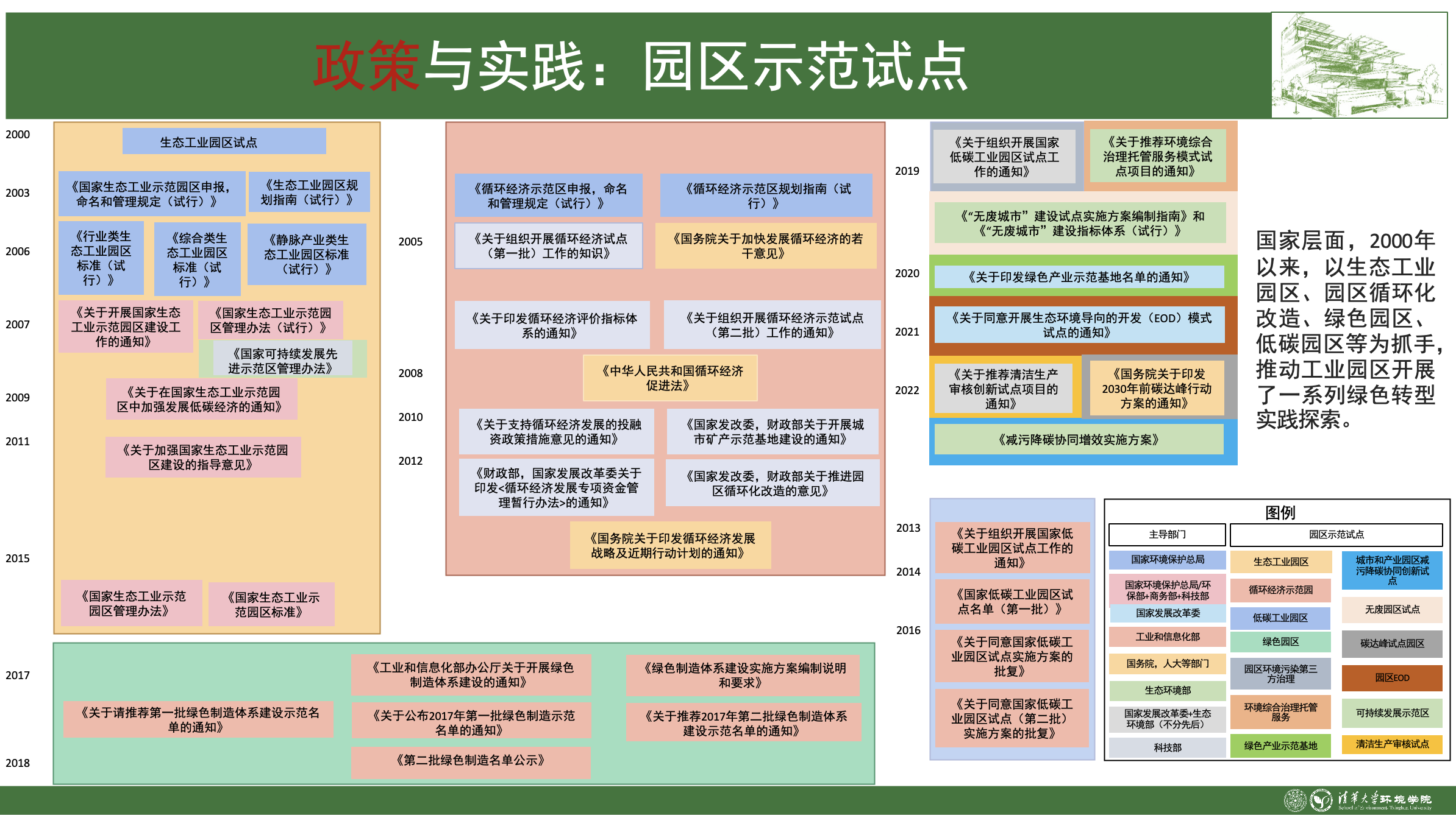 “双碳”目标发布以来,针对园区绿色低碳发展,国家加强顶层设计,提出了“开展碳达峰试点园区建设”“实施园区节能降碳工程”“建设绿色工厂和绿色工业园区”“推进产业园区循环化发展”“加强园区物质流管理”等一系列行动部署和工作指引。自2000年以来,国务院以及国家发展和改革委员会、生态环境部、科学技术部等部委的各类重要文件中提及10余类示范试点园区,主要以生态工业园区、园区循环化改造、绿色园区、低碳园区等为抓手,开展了一系列绿色转型实践探索,积累大量特色案例,取得了积极成效。
