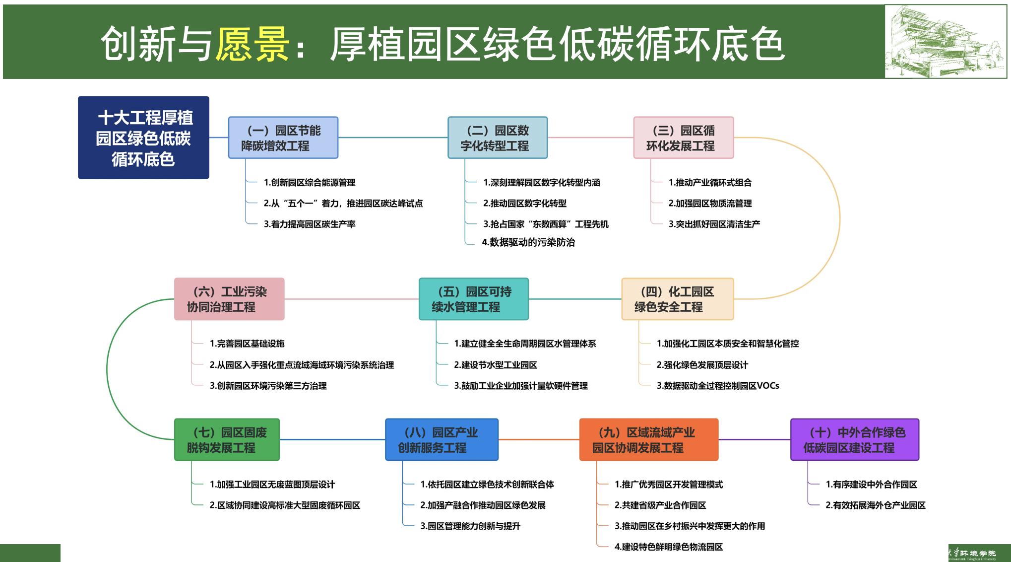 面向未来,报告最后提出了厚植园区绿色低碳循环底色的十大工程愿景,分别是:园区节能降碳增效工程、园区数字化转型工程、园区循环化发展工程、化工园区绿色安全工程、园区可持续水管理工程、工业污染协同治理工程、园区固废脱钩发展工程、园区产业创新服务工程、区域流域产业园区协调发展工程、中外合作绿色低碳园区建设工程。