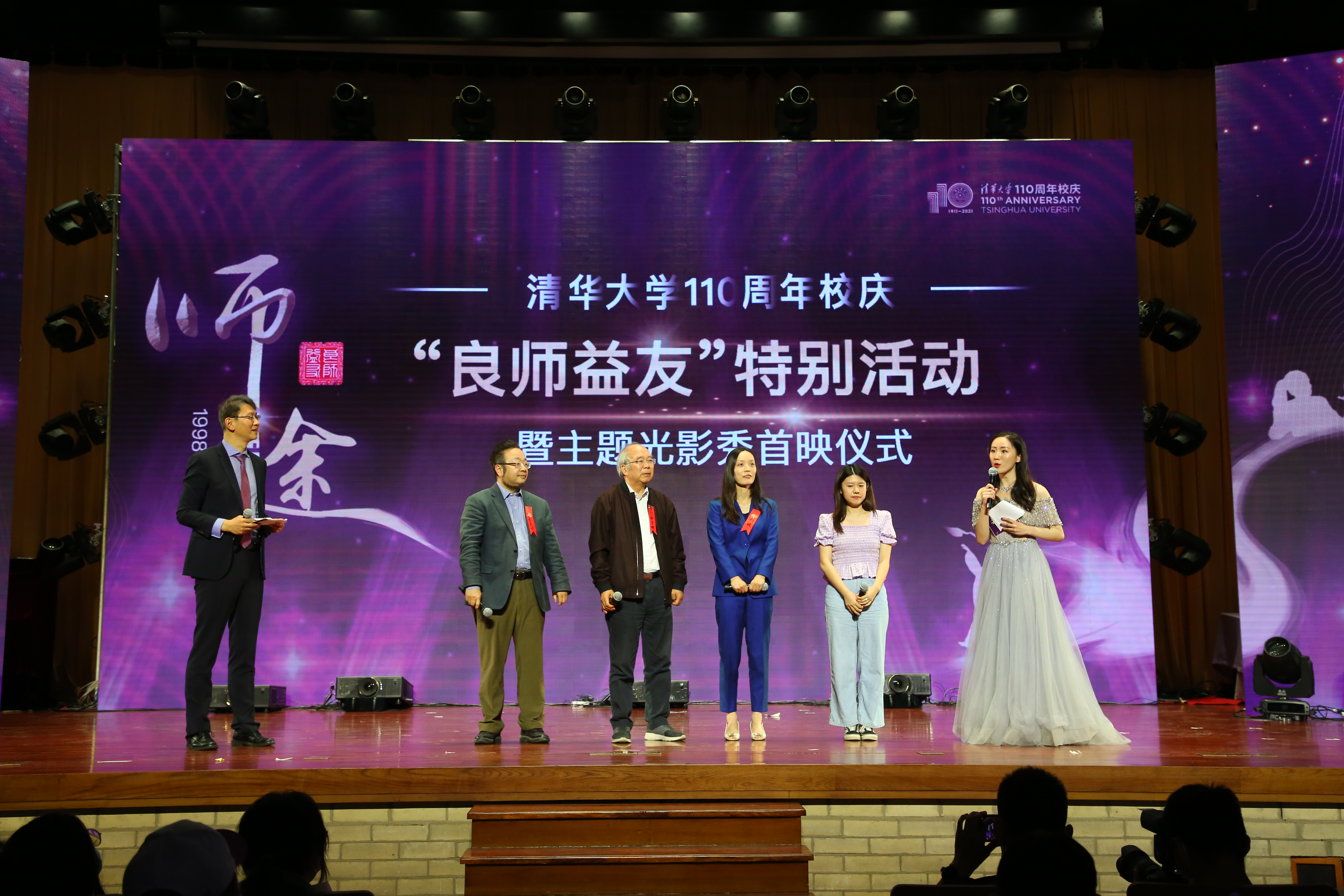 清华大学110周年校庆“良师益友”特别活动上,郝吉明(左三)、贺克斌(左二)、刘欢(右三)和刘欢的学生四代师生,讲述团队精神。
