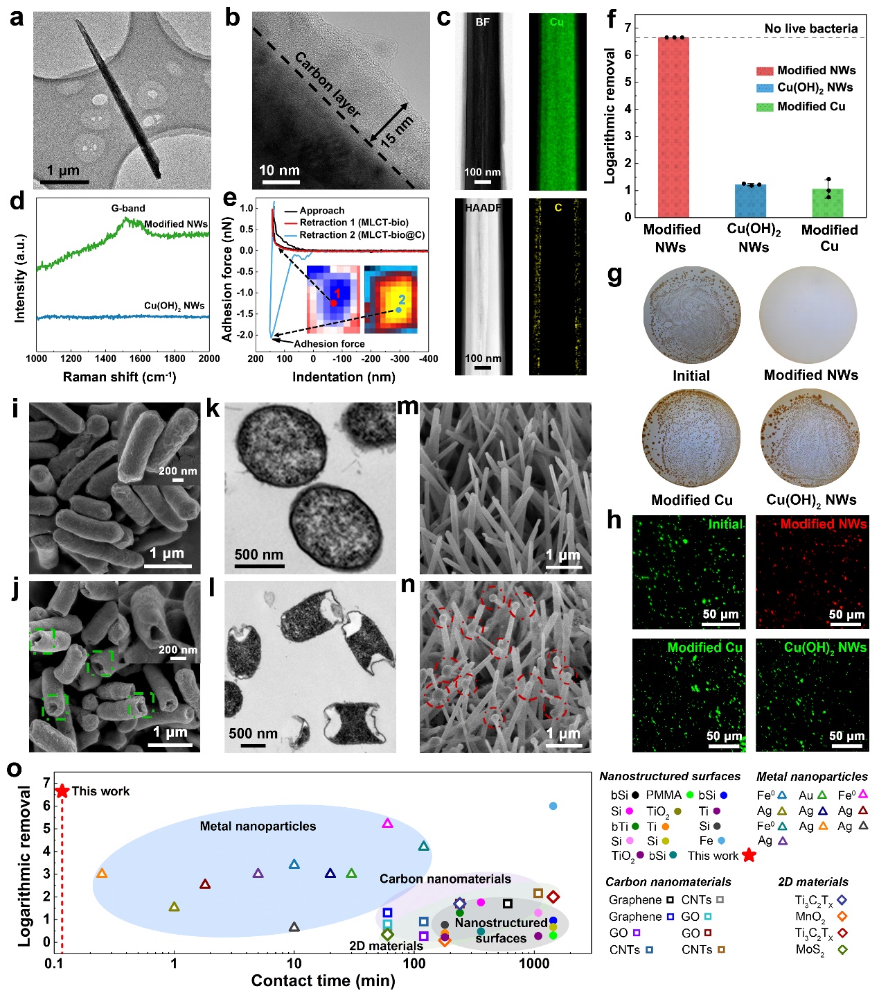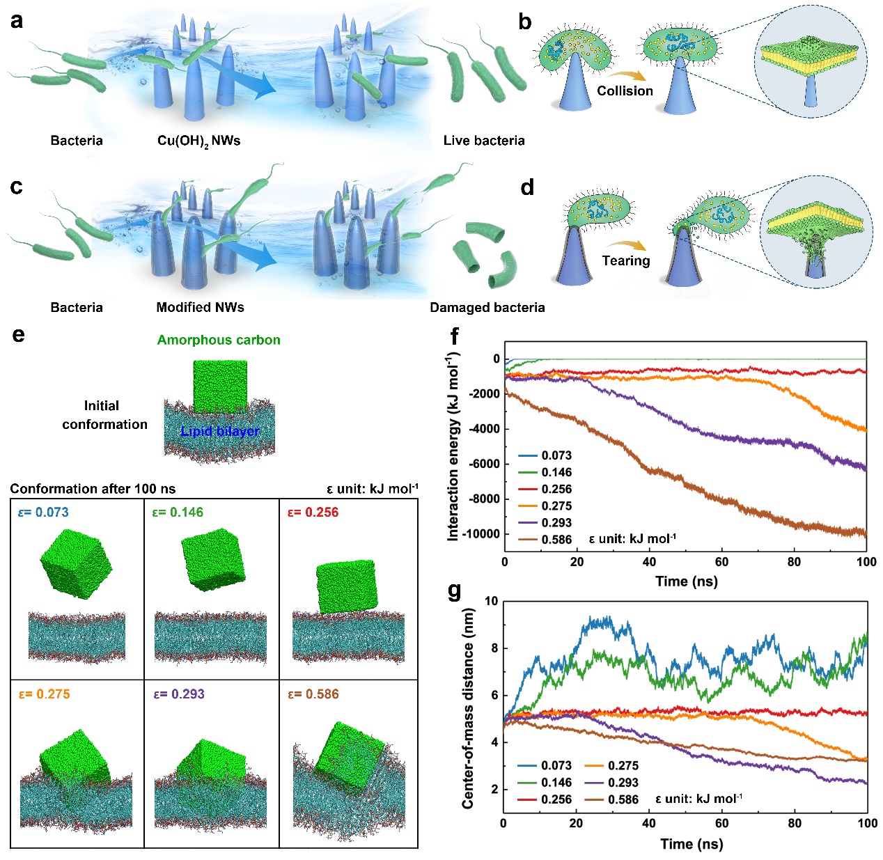 研究人员利用多孔泡沫铜制备了碳包覆纳米线,当受污染水样流经该材料时,即可对水中细菌造成严重的机械破损(图2)。结合流场计算、细菌机械强度测试,以及细菌受力有限元模拟,证实碳包覆纳米尖端的瞬时粘附-流场撕扯效应能够突破细菌的临界应力,而水流冲击下细菌与纳米尖端发生的碰撞作用不能破坏细菌。
