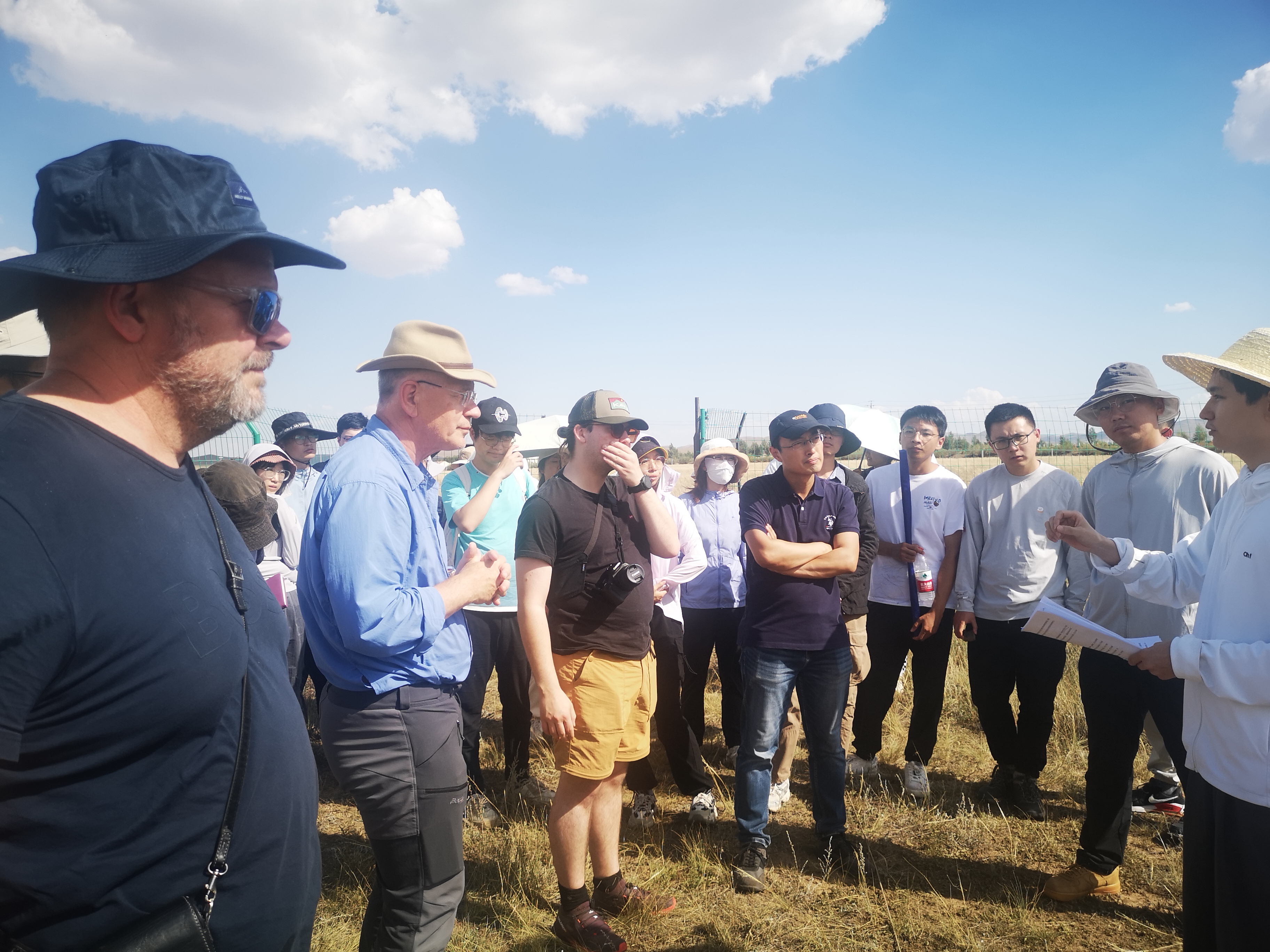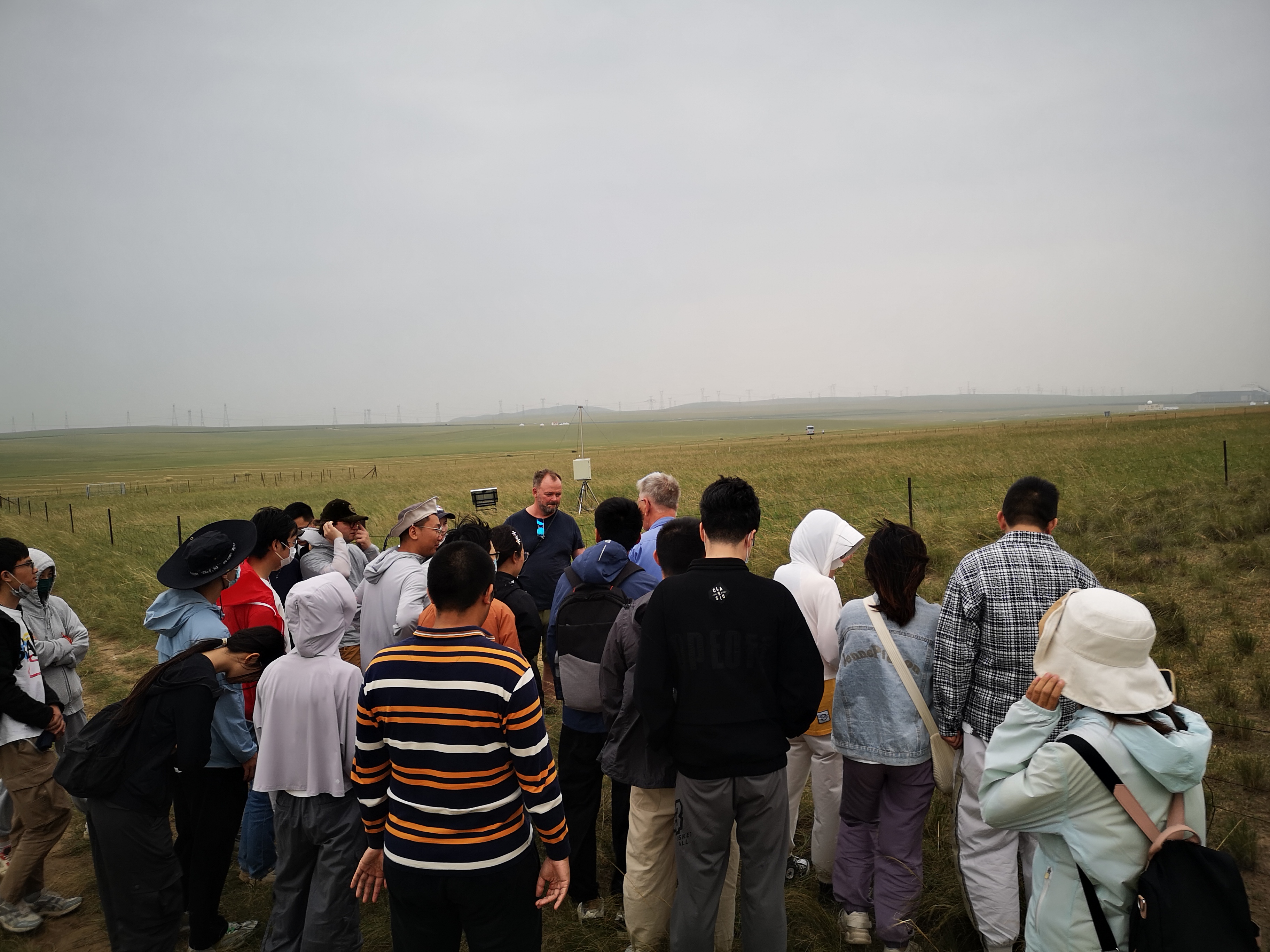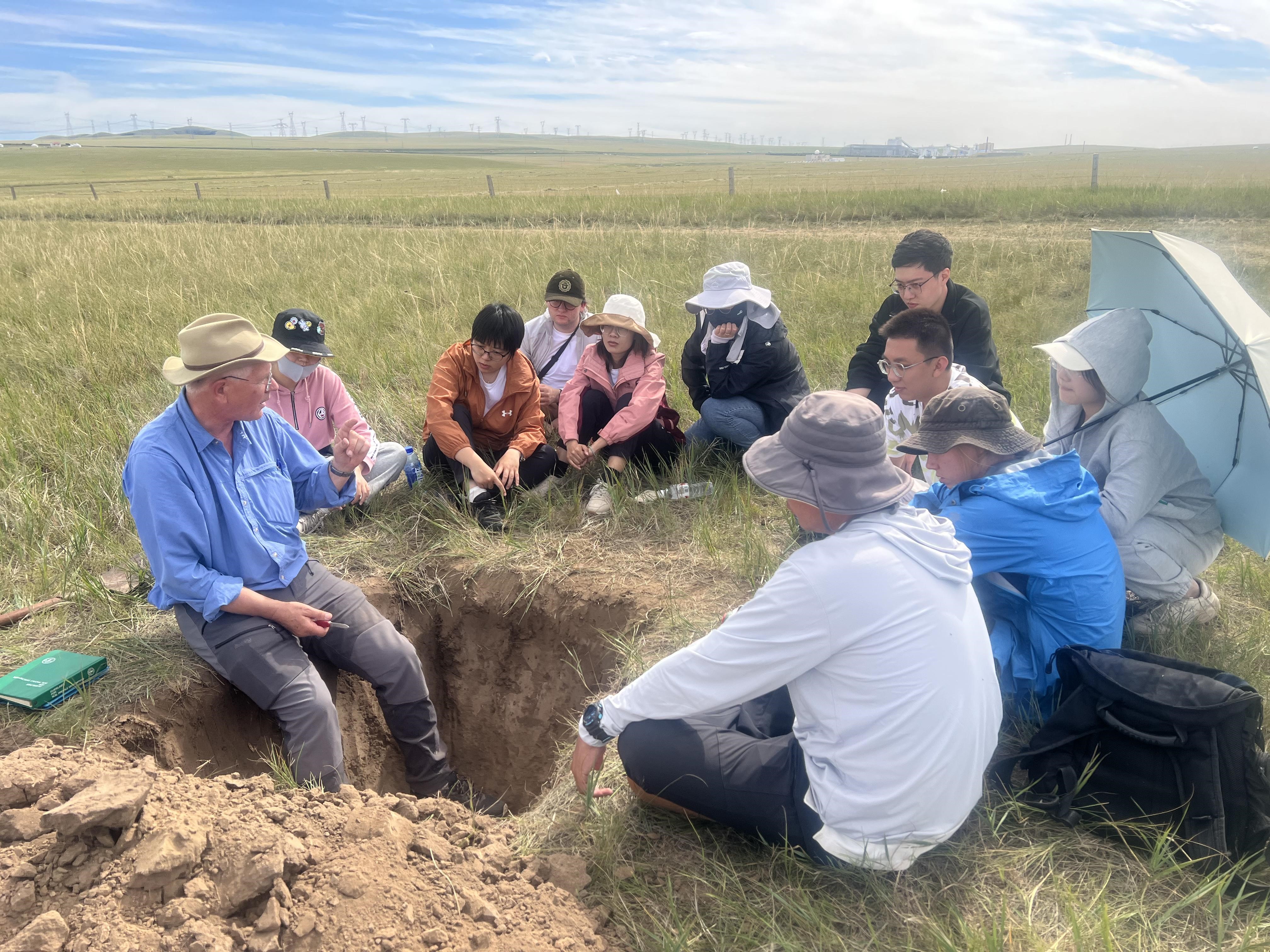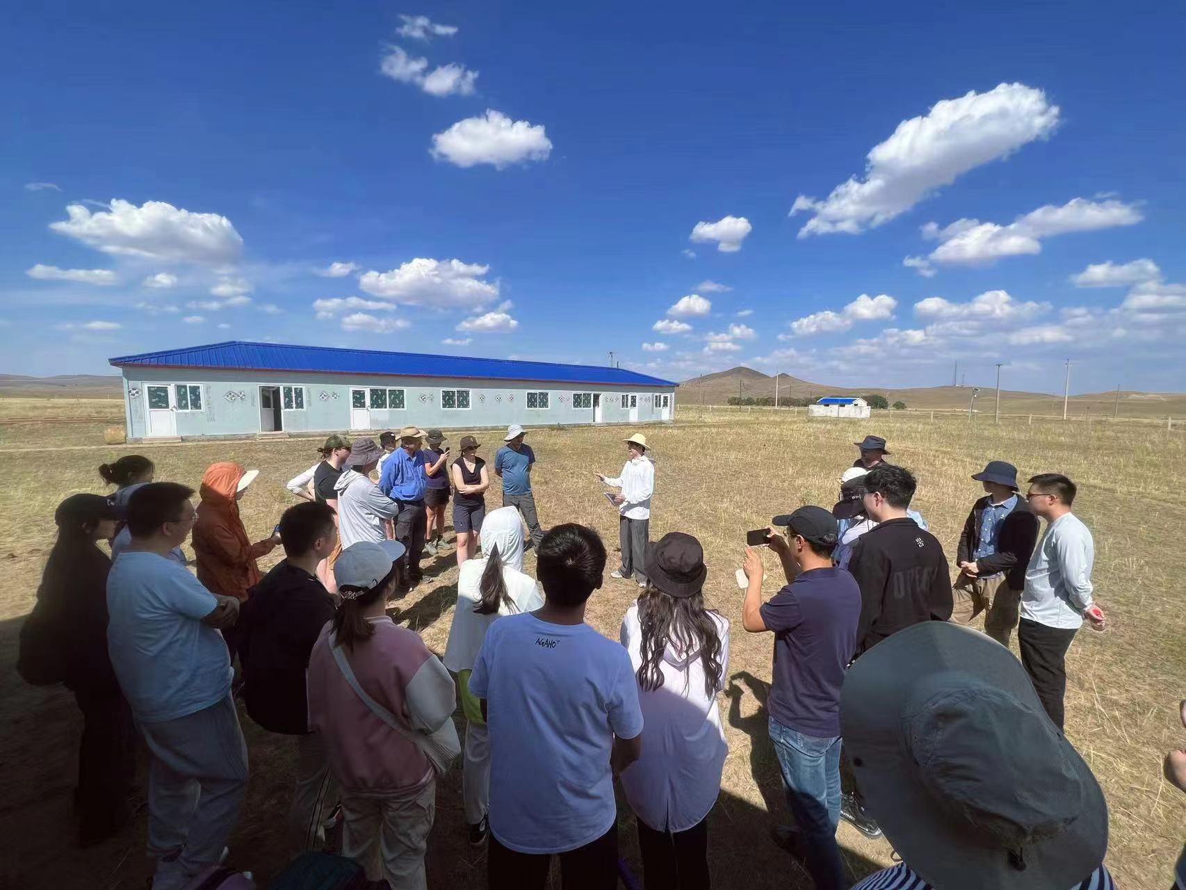 在内蒙古大学草原生态学研究基地,学员们巧遇前来实习的内蒙古大学的同学们,带队的包铁军老师热情地介绍了当地的植被类型、草原利用方式以及在实验站进行的研究课题,包括学员们特别感兴趣的气候变化与放牧活动对草原土壤和植被的影响等。