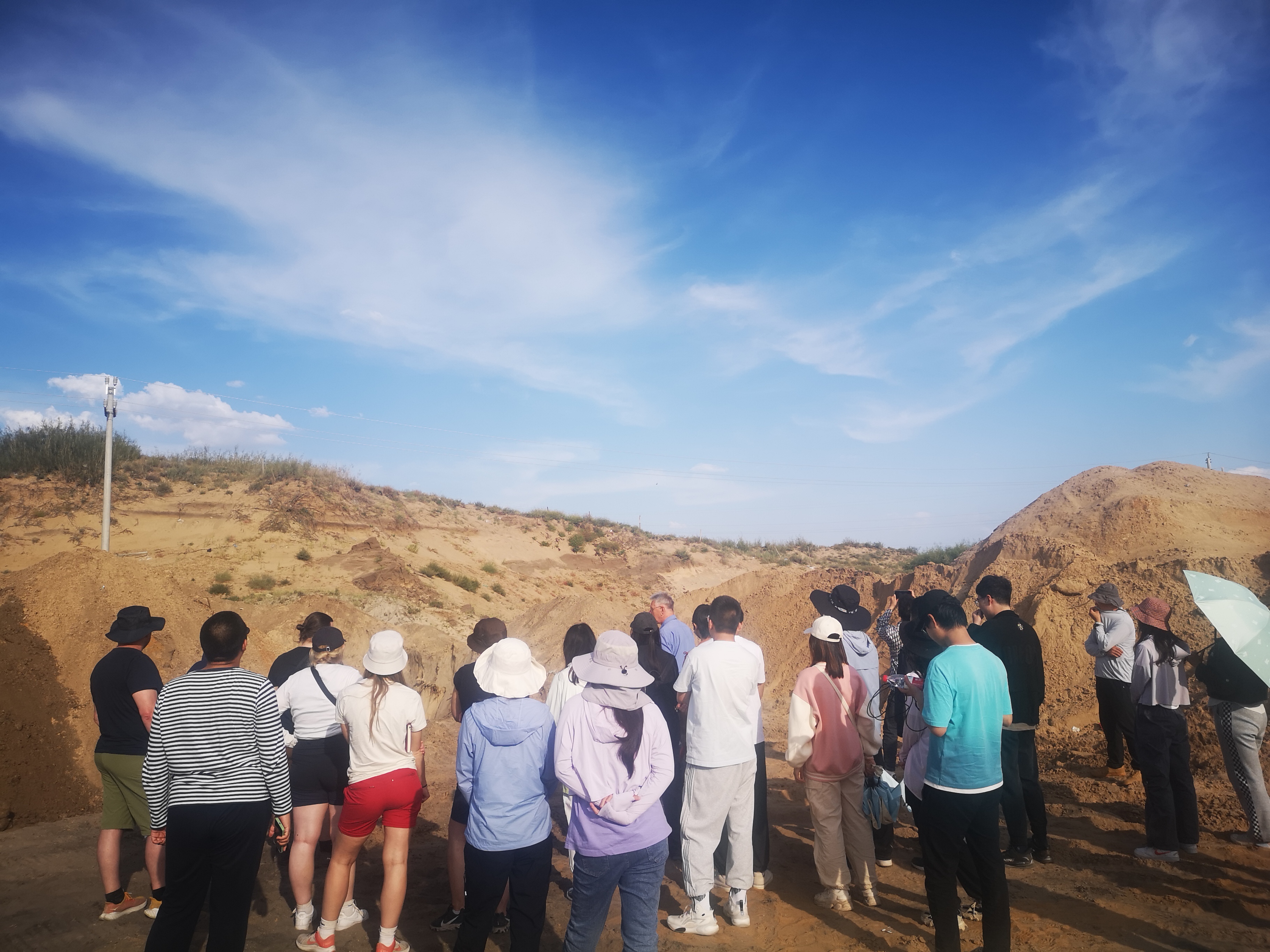 途经浑善达克沙地时,道路施工的开挖现场提供了现场学习土壤的条件。Jan Mulder教授讲授了风沙土的形成过程并引导学员们通过手背感受、判断土壤的质地,并回答了同学们的各种提问,比如如何通过土层、矿物和植物等特征推断土壤年龄。