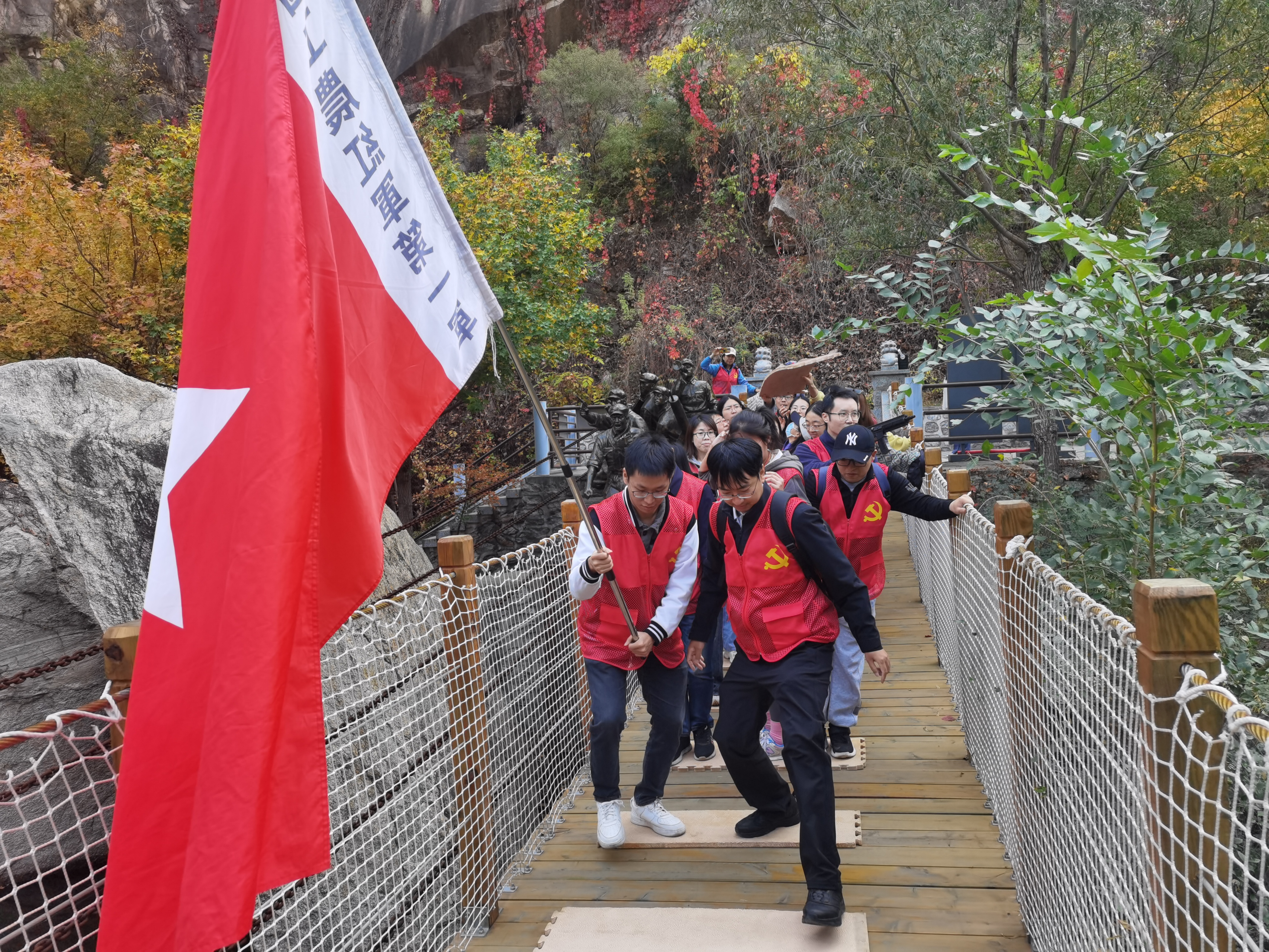 追忆长征历史。走在青龙峡文化长廊,党员们追忆了血战湘江、四渡赤水、巧渡金沙江、飞夺泸定桥、草地徒涉、北上会师等长征历史事件,并且在专业老师的带领下开展了以飞夺泸定桥、重走长征路、北上会师历史故事为背景的沉浸式情景体验活动。在飞夺泸定桥环节,水环境所党支部书记张潇源带领大家在“敌人”的重重围攻下,一步步通过传递木板艰难度过了桥面;在北上会师环节,“中国工农红军第一军”和“中国工农红军第二军”庄严会师,并互相授旗,再一次深刻领悟了革命先辈们忠诚于党、矢志不移的坚定信念和不怕牺牲、顽强拼搏的革命精神;在重走长征路环节,旗手高高举旗,红旗迎风飘扬,大家怀着崇敬的心情,体会着红军当年浴血奋战、向死而生的革命精神。