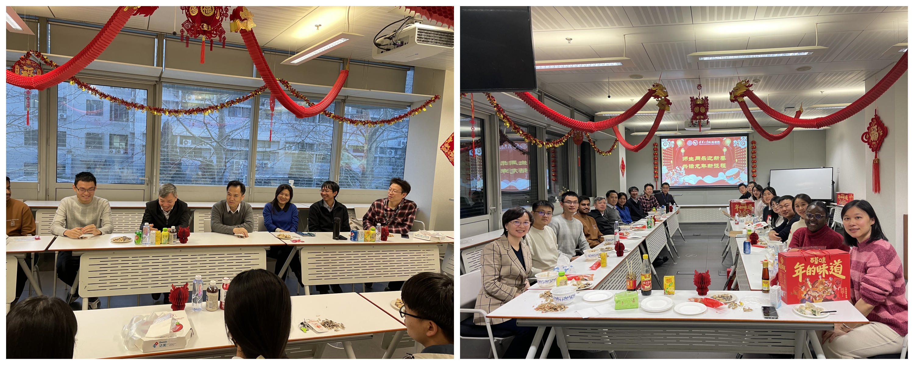 MK官网2024年2月2日电(通讯员 杜卓)在2024年甲辰龙年即将到来之际,环境学院以“师生同乐迎新春,共话龙年新征程”为主题,慰问春节留校学生。2月1日下午,师生新春交流座谈会在中意清华环境节能楼209会议室举行,院长刘书明,党委书记王灿,副院长徐明,党委副书记王书肖、席劲瑛,院长助理张潇源,研工组组长吉庆华以及学院机关的王戈辉和杜卓老师,与十余名春节期间留校过年的学生欢聚一堂,回顾过去一年的学习生活,共同展望美好未来。