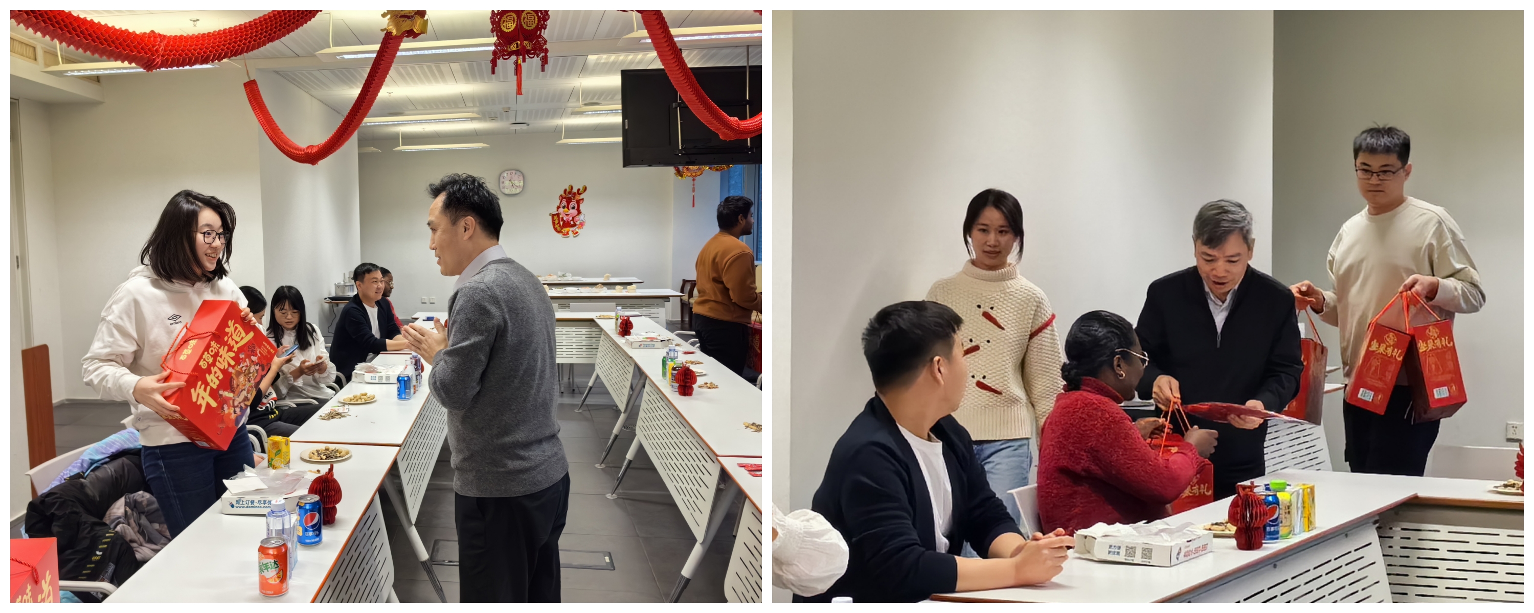 刘书明和王灿为同学们送上了学院精心准备的坚果礼盒、节日挂饰和龙年小摆件,祝愿同学们在新的一年里学业顺利、收获满满。