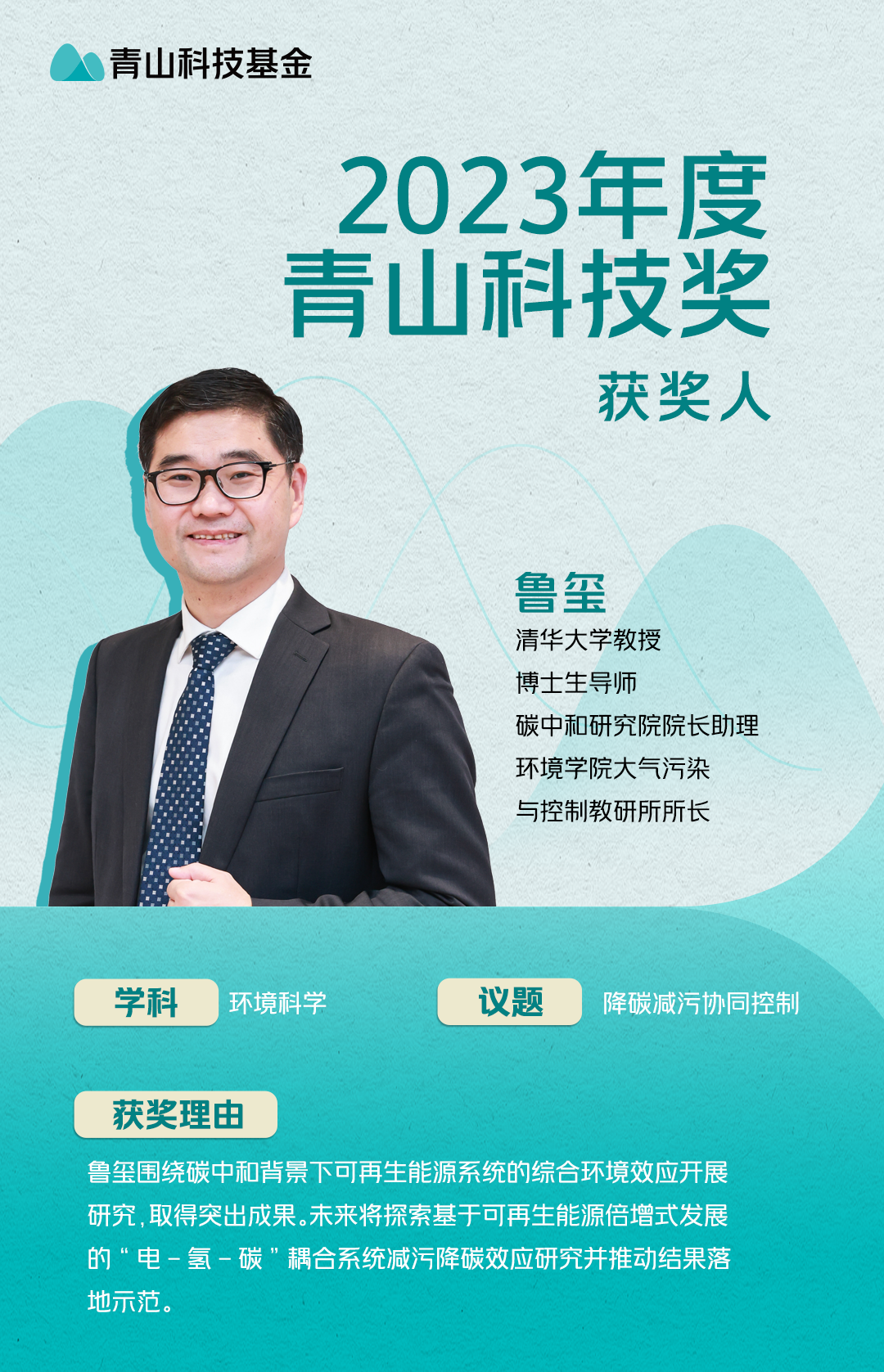 鲁玺致力于可再生能源与化石能源多区域、多部门协同转型机制与环境协同效应优化建模研究,提出可再生能源“供-用”全链条综合评估技术,为碳中和背景下国家、地区和园区开发利用可再生能源提供综合评估分析工具与数据库支撑。其研究成果以第一作者或通讯作者发表在《科学》(Science)、《美国科学院院刊》(PNAS)、《自然·能源》(Nature Energy)、《自然·气候变化》(Nature Climate Change)、《自然·食物》(Nature Food)、《自然·可持续发展》(Nature Sustainability)、《自然·通讯》(Nature Communications)、《焦耳》(Cell子刊Joule)、《一个地球》(Cell子刊One Earth)等国际顶级期刊,9篇被选为封面论文;担任中国工业节能与清洁生产协会碳中和专业委员会主任,中国环境科学学会青年科学家分会常务副主任/秘书长,多个国内外能源环境领域SCI期刊编辑与编委;曾获北京市先进科技工作者、清华大学碳中和能力提升项目优秀指导教师奖、清华大学教学优秀奖、第十五届中国青年科技奖、中国环境科学学会青年科学家奖(金奖)等。