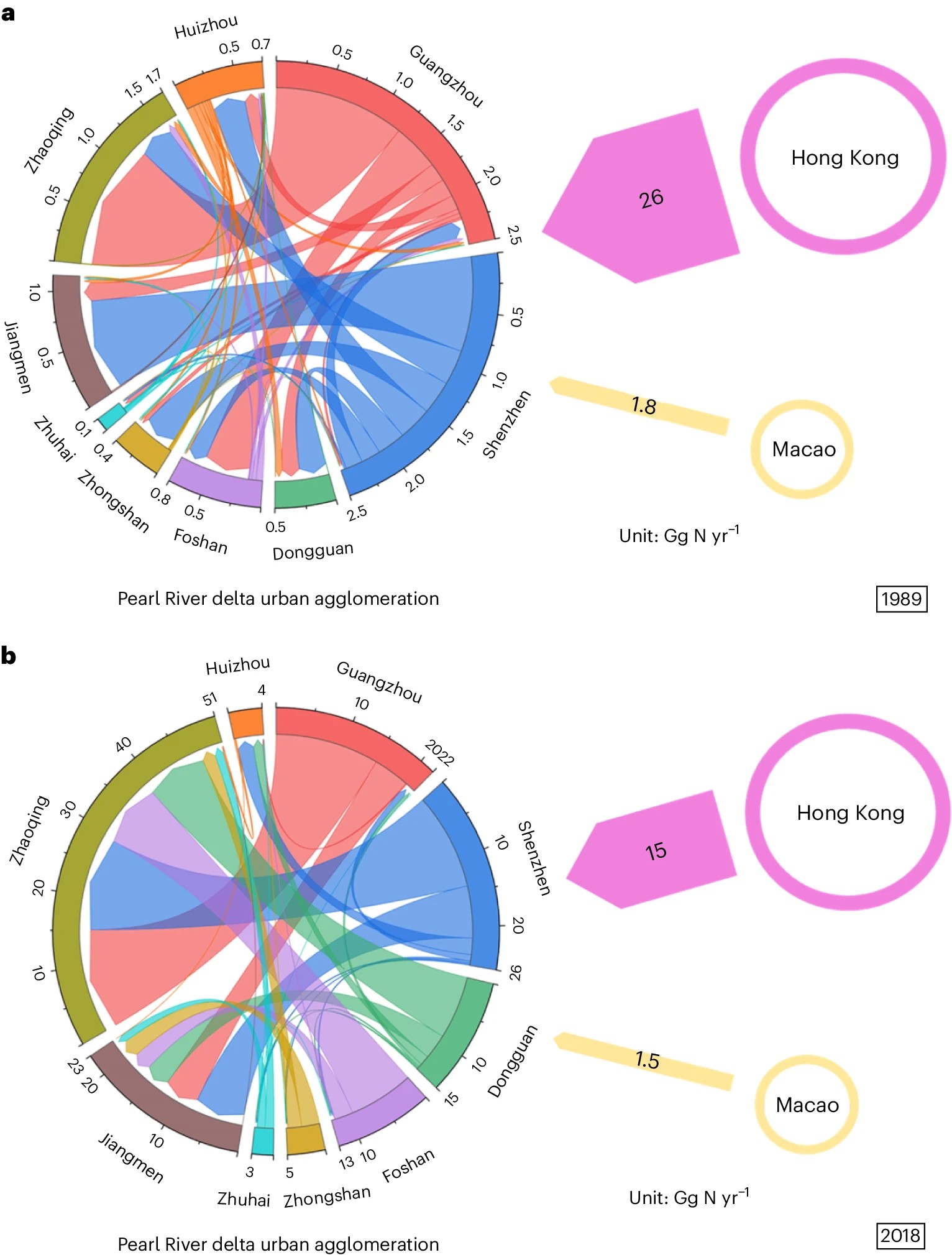 图3 香港、澳门和珠三角城市群间的食品贸易隐含氮污染转移。a. 1989年。b. 2018年。