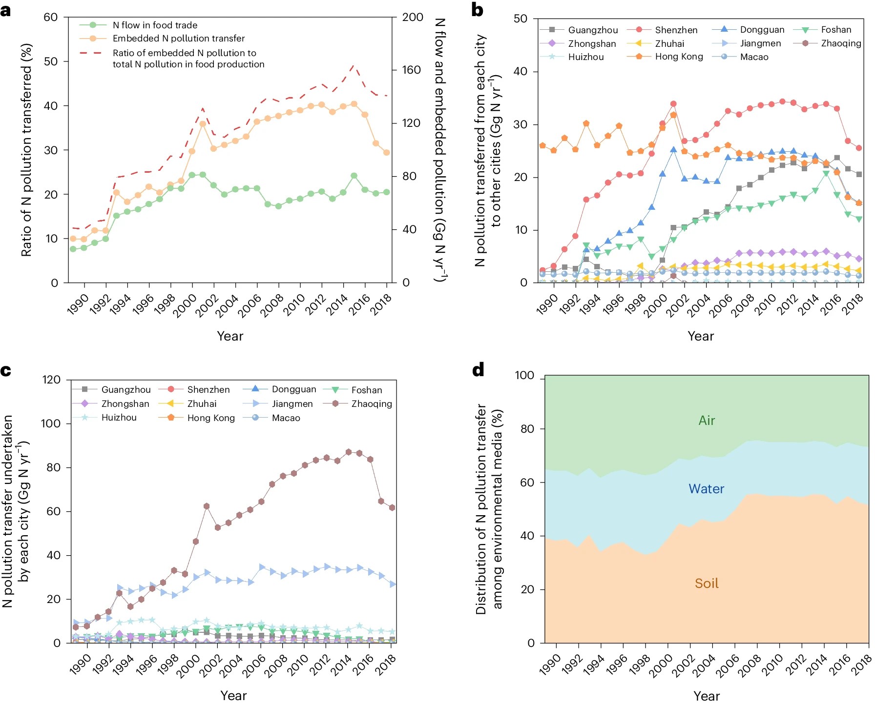 图2 1989-2018年大湾区城市间食品贸易隐含氮污染。a. 食品贸易中的氮流和隐含氮污染转移,及贸易隐含氮污染占总农业生产氮污染的比例。b. 各城市向其他城市转移的氮污染。c. 各城市承担的氮污染转移。d. 城市间氮污染转移在各环境介质中的分布。