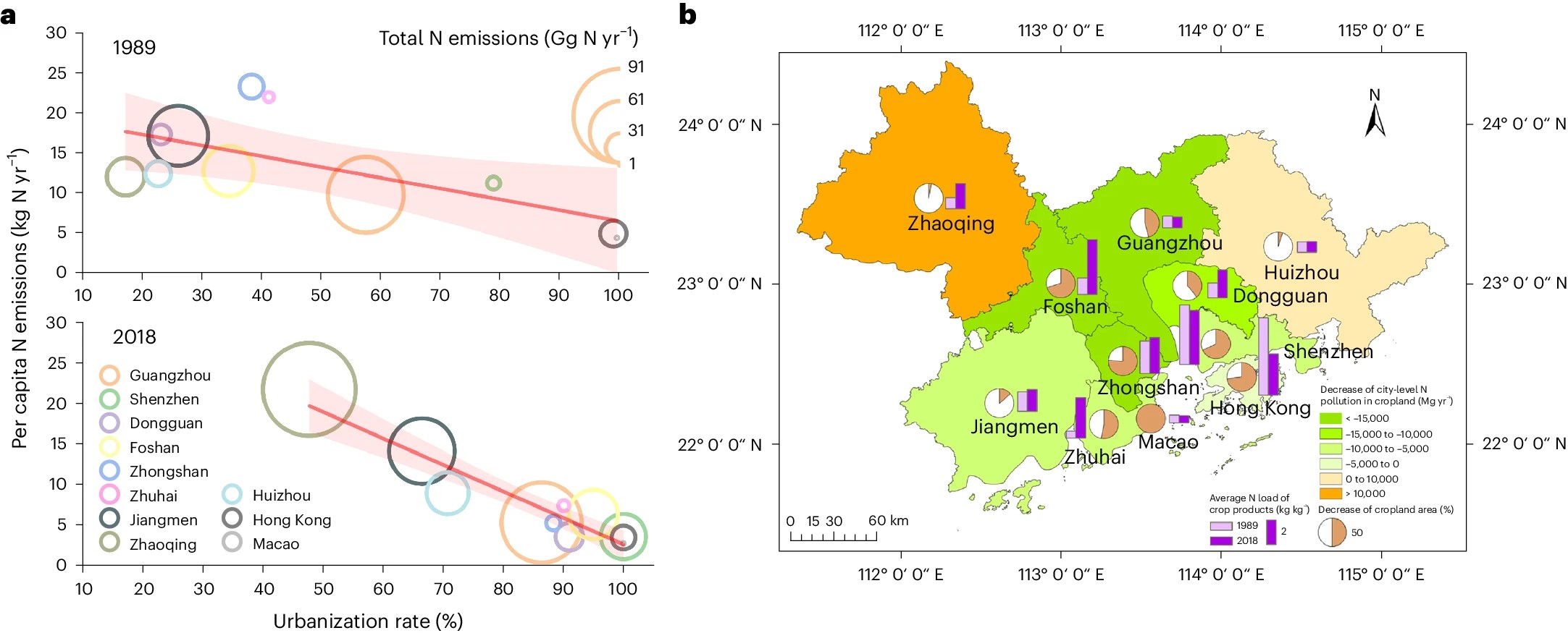 图1. 大湾区 11个城市食品系统氮排放特征(1989、2018年)。a. 城市化率与氮排放之间的关系。每个圆圈的位置代表一个城市的城市化率和人均氮排放量,圆圈的大小与城市总氮排放量成正比。b. 1989-2018年城市耕地面积(饼图)、耕地氮排放(背景色)和作物平均氮负荷(直方图)的变化。