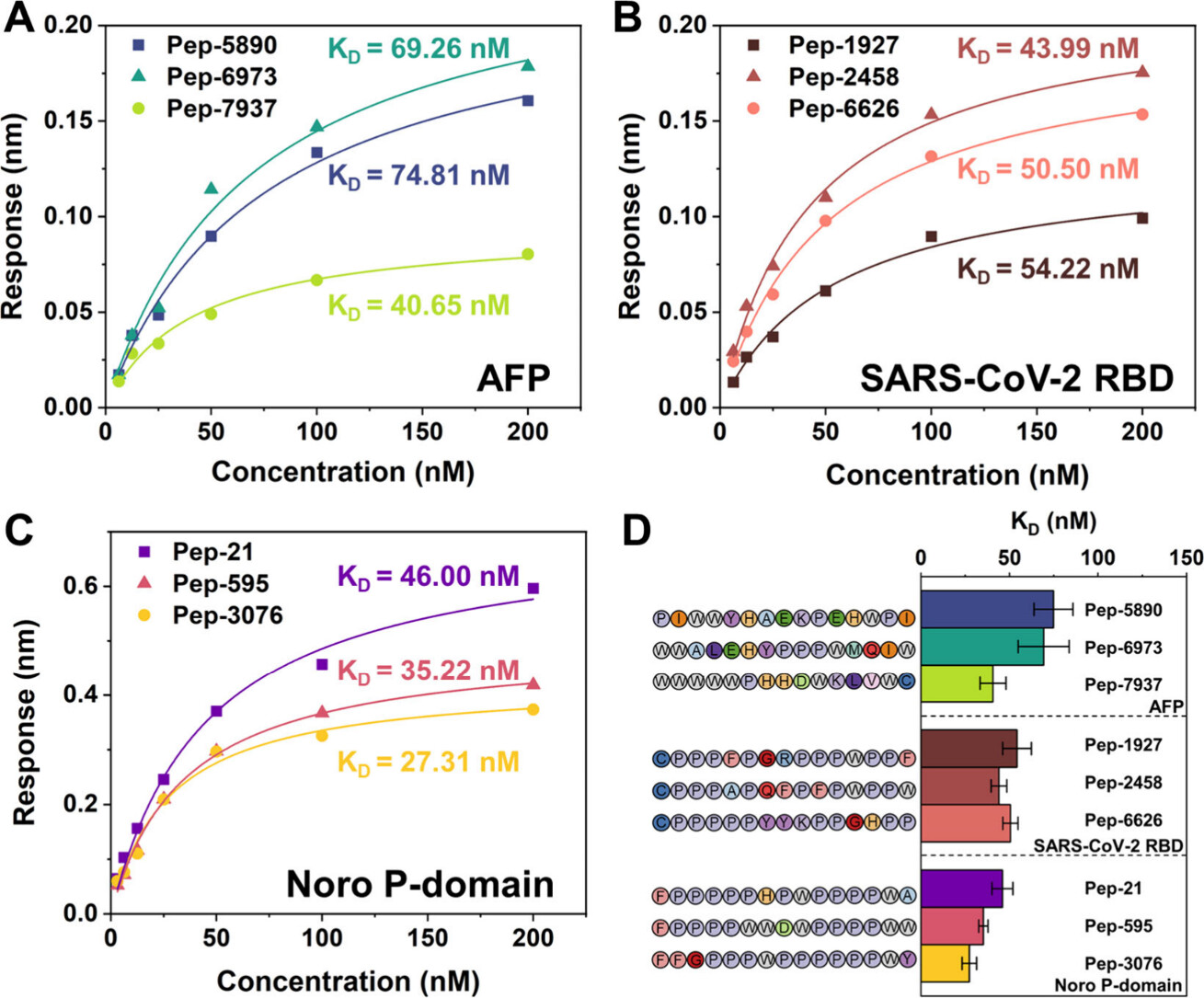 图2.高亲和力肽与目标蛋白的分子互作表征