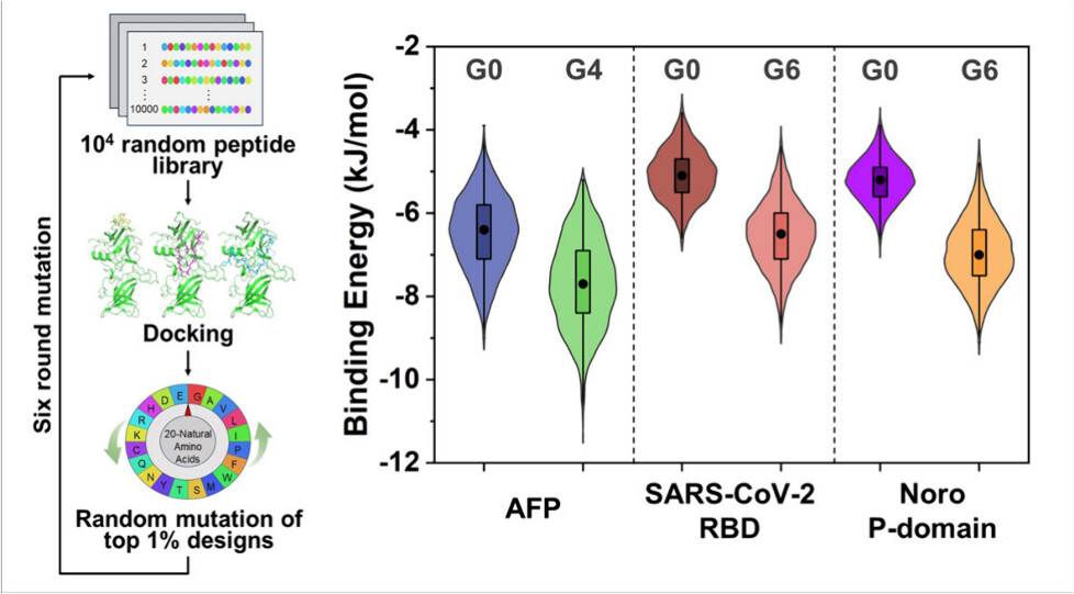 高通量虚拟筛选在扩大文库容量以增强肽序列多样性,从而筛选出高亲和力肽的过程中仍面临许多挑战。为此,周小红课题组研究提出了一种全新的从头设计策略,构建了一个包含104个随机肽的生成库,并通过自主开发的并行化高通量虚拟筛选程序与目标蛋白进行对接。通过筛选排名前1%的肽并对其进行随机突变,该策略理论上能够将文库容量扩展至1014个肽序列,从中挑选出亲和力最强的肽。作为概念验证,这一方法已成功应用于多种目标蛋白的筛选,包括肿瘤标志物(甲胎蛋白)和病毒表面蛋白(新冠病毒S蛋白受体结合域和诺如病毒P结构域),并成功鉴定出在纳摩尔浓度范围内具有高亲和力的肽。该研究的通用性和可扩展性为快速发现高亲和力肽提供了经济高效的方法支持,特别是在应对突发疫情大流行暴发时,展现了快速响应的潜力。