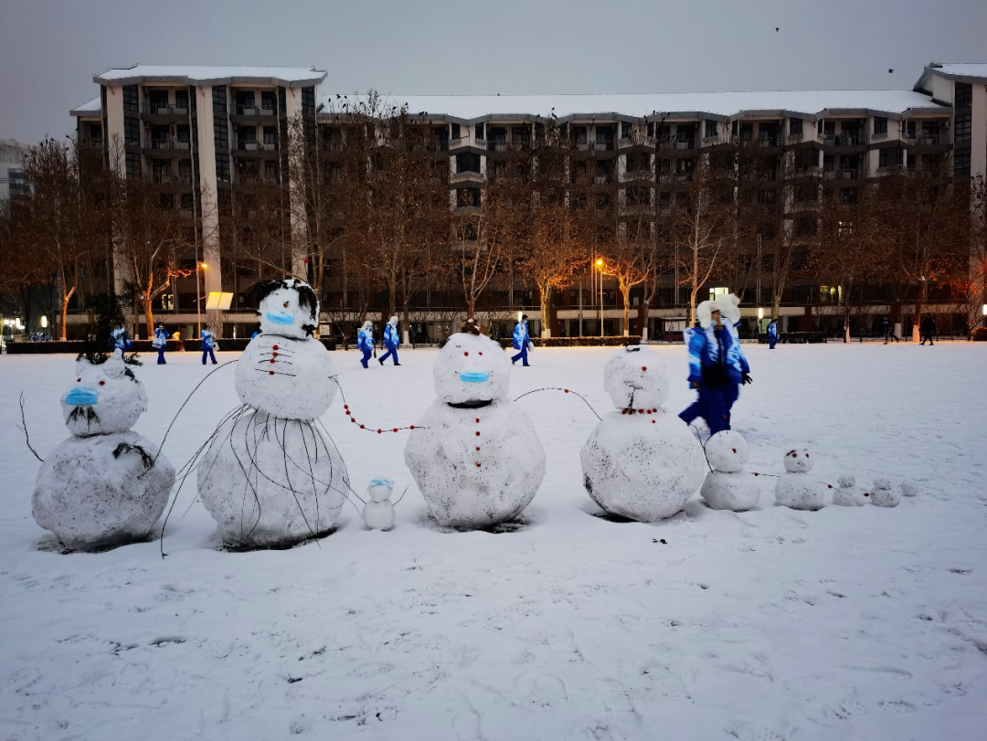 在第一次大联排的时候,那天我们早上六点半就要出发,前一天下了一夜的雪,早上起来去紫荆吃过早饭后,走在紫操上,整个紫操都是穿着蓝色制服的志愿者,地上也留下了或深或浅的脚印,紫操上还已经有人堆了两个雪人。这是我们场馆服务志愿者第一次集体行动,就伴着雪,伴着黎明的曙光,非常应景,也让我印象十分深刻。