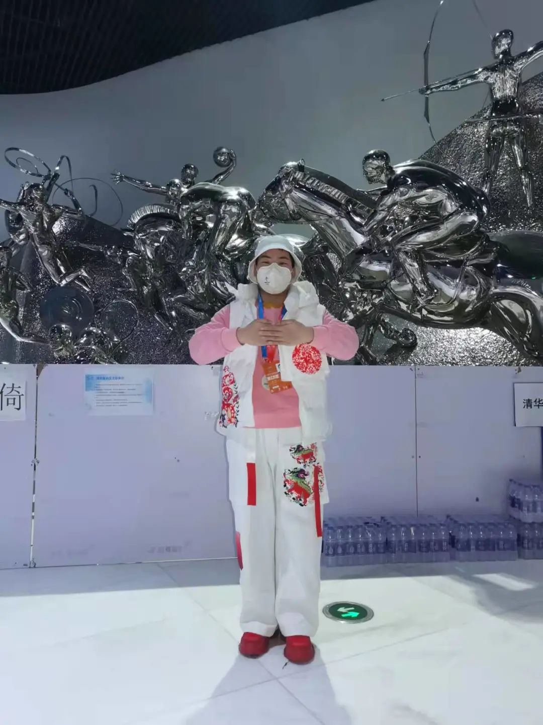 刘松:我是2019年12月提交的报名信息,当时参加70周年国庆专项的激动心情还未褪去,想着2022年将是自己在清华的最后一年,如有机会再参加一次重大活动将十分有纪念意义。我是这次冬奥开幕式标兵演员。为了这次冬奥志愿服务,我也做了很多准备。提前开展自己的科研、找工作等计划,比如2021年上半年就开始投简历和跟导师讨论博士论文结构,10月开始训练的时候保证自己论文和工作都在正轨,这样使参加冬奥志愿成为自己毕业季的缓压活动。开幕式那天与一位陌生运动员的击掌让我印象非常深刻:我们的退场路线会经过运动员区域,跟他们挥手时一位运动员主动过来跟我击了个掌,当时感觉我们“气氛组”的热情得到了反馈,那一瞬间的感动让我非常难忘。