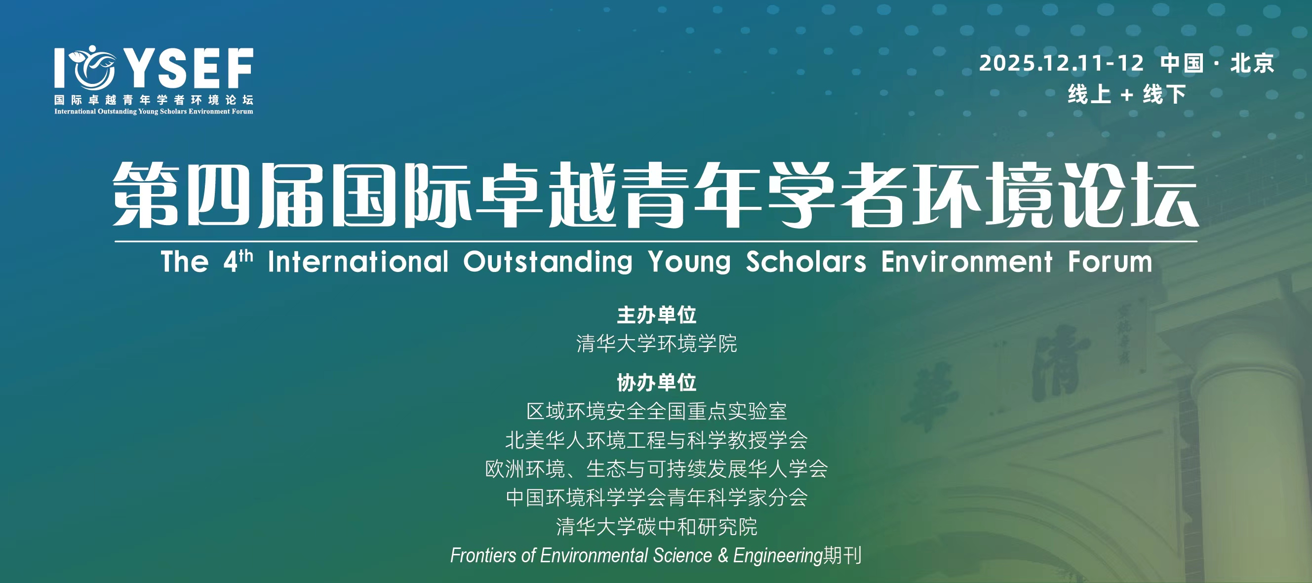 第四届国际卓越青年学者环境论坛将于2025年12月11日-12日在北京召开。除主办方特邀的本领域知名学者外,论坛将面向国内外取得高水平成果的卓越青年人才开放申请,并将评选“International Outstanding Environmental Young Scholar”。