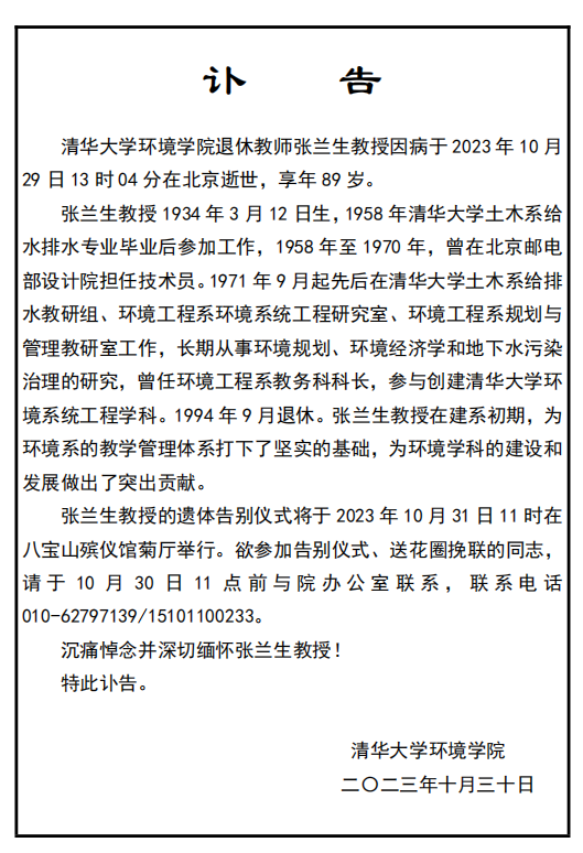 讣告-环境学院退休教师张兰生教授