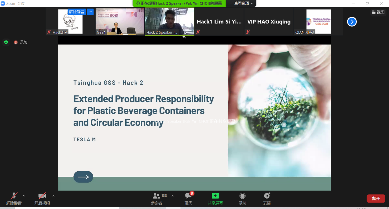 继6月28-6月29日的破冰与组队环节之后,可持续发展马拉松项目Hack2的参与者在环境学院师生团队的帮助下,于接下来的5天内陆续完成了听取主旨演讲、头脑风暴、问题调研、阶段性汇报等活动环节,并于7月5日进行了Hack2的最终汇报。针对多样的环境问题,12支队伍各自展示了自己颇具创意的解决方案,其中由Choi Pak Yin等6位同学组成的Tesla M队斩获了Hack2的杰出团队奖,并代表Hack2在总会场做精彩展示。